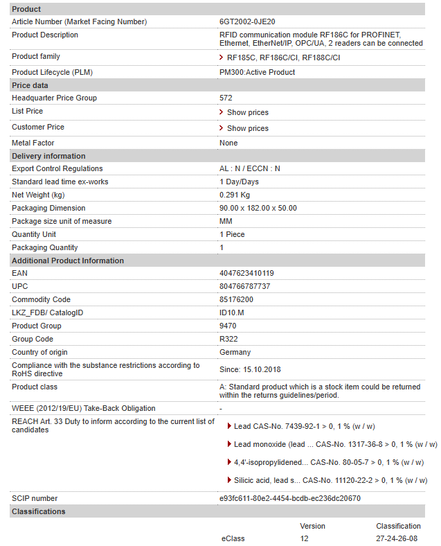 RFID communication module RF186C for PROFINET, Ethernet, EtherNet/IP, OPC/UA, 2 readers can be connected