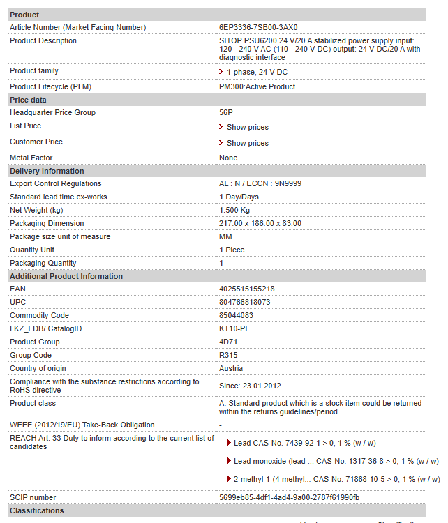 SITOP PSU6200 24 V/20 A stabilized power supply input: 120 – 240 V AC (110 – 240 V DC) output: 24 V DC/20 A with diagnostic interface
