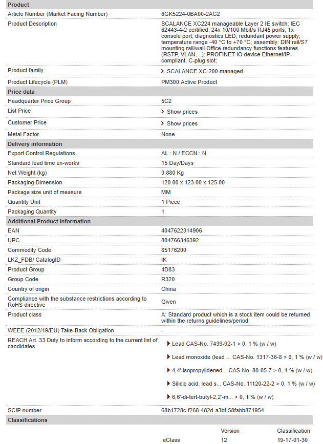 SCALANCE XC224 manageable Layer 2 IE switch; IEC 62443-4-2 certified; 24x 10/100 Mbit/s RJ45 ports; 1x console port, diagnostics LED; redundant power supply; temperature range -40 °C to +70 °C; assembly: DIN rail/S7 mounting rail/wall Office redundancy functions features (RSTP, VLAN,…); PROFINET IO device Ethernet/IP-compliant, C-plug slot;