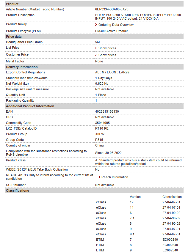 SITOP PSU2200 STABILIZED POWER SUPPLY PSU2200 INPUT: 100-240 V AC output: 24 V DC/10 A
