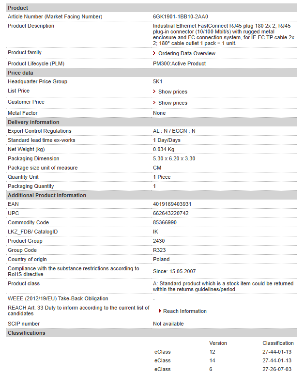 Industrial Ethernet FastConnect RJ45 plug 180 2x 2, RJ45 plug-in connector (10/100 Mbit/s) with rugged metal enclosure and FC connection system, for IE FC TP cable 2x 2; 180° cable outlet 1 pack = ……
