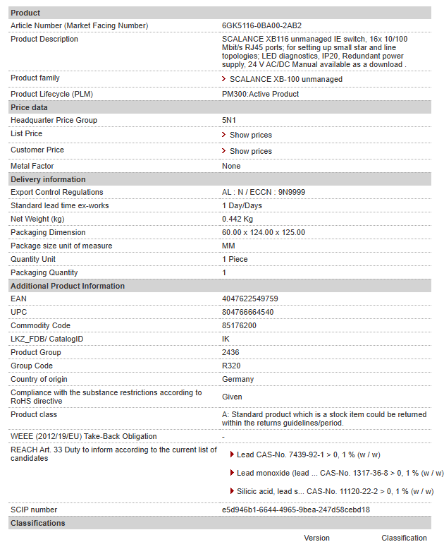 SCALANCE XB116 unmanaged IE switch, 16x 10/100 Mbit/s RJ45 ports; for setting up small star and line topologies; LED diagnostics, IP20, Redundant power supply, 24 V AC/DC Manual available as a download .