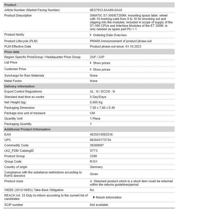 SIMATIC S7-300/ET200M, mounting space label. wheel with 19 marking nails from 0 to 18 for knocking out and clipping into the modules; included in scope of supply of the S7-300 CPUs and Interface Modules of the ET 200M. is only needed as spare part PU = 1
