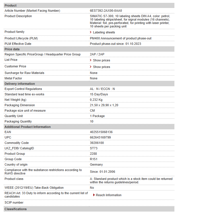 SIMATIC S7-300, 10 labeling sheets DIN A4, color: petrol, 10 labeling strips/sheet, for signal modules (16 channels), Material: foil, pre-perforated, for printing with laser printer, 10 sheets per packing unit