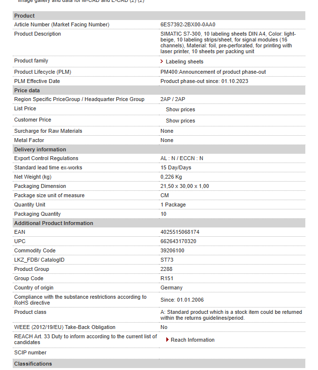 SIMATIC S7-300, 10 labeling sheets DIN A4, Color: light-beige, 10 labeling strips/sheet, for signal modules (16 channels), Material: foil, pre-perforated, for printing with laser printer, 10 sheets per packing unit