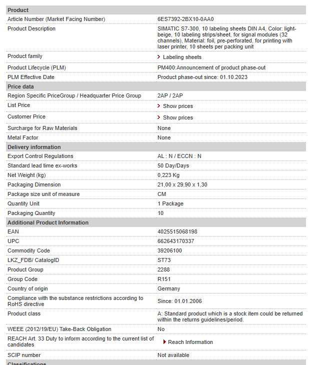 SIMATIC S7-300, 10 labeling sheets DIN A4, Color: light-beige, 10 labeling strips/sheet, for signal modules (32 channels), Material: foil, pre-perforated, for printing with laser printer, 10 sheets per packing unit