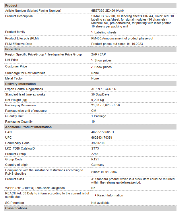 SIMATIC S7-300, 10 labeling sheets DIN A4, Color: red, 10 labeling strips/sheet, for signal modules (16 channels), Material: foil, pre-perforated, for printing with laser printer, 10 sheets per packing unit