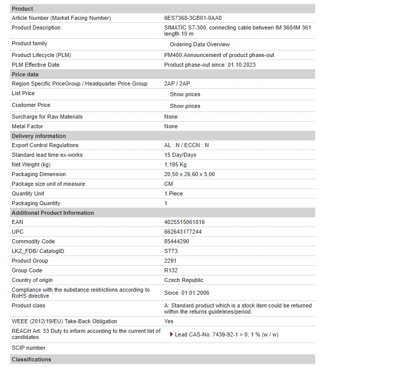 SIMATIC S7-300, connecting cable between IM 360/IM 361 length 10 m
