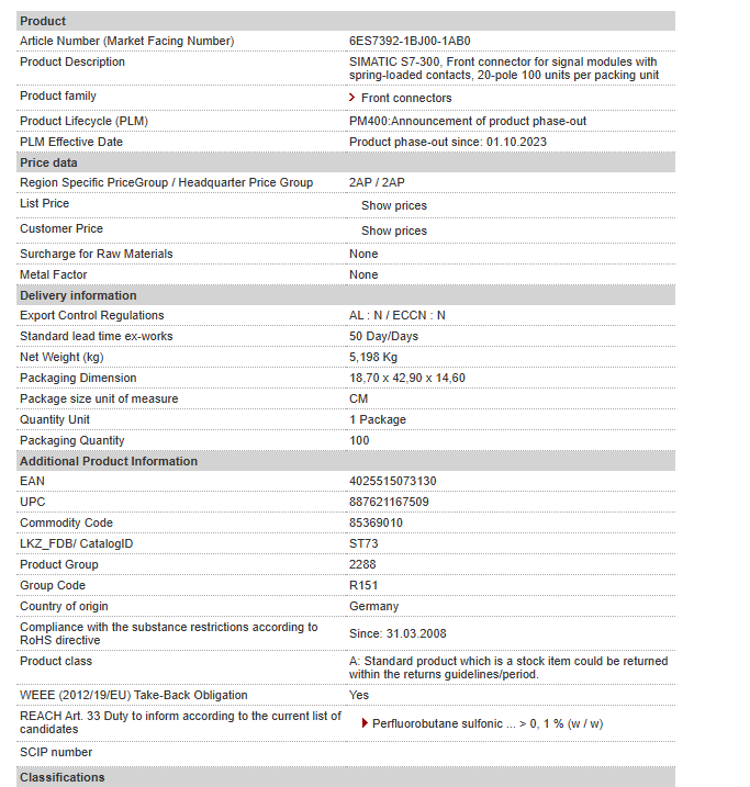 SIMATIC S7-300, Front connector for signal modules with spring-loaded contacts, 20-pole 100 units per packing unit