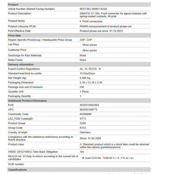 SIMATIC S7-300, Front connector for signal modules with spring-loaded contacts, 40-pole
