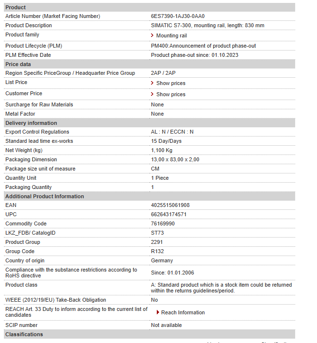 SIMATIC S7-300, mounting rail, length: 830 mm