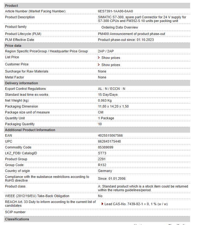 SIMATIC S7-300, spare part Connector for 24 V supply for S7-300 CPUs and FM352-5 10 units per packing unit