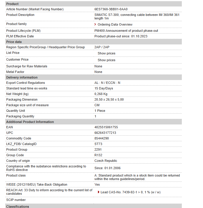 SIMATIC S7-300, connecting cable between IM 360/IM 361 length 1m