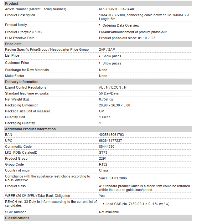 SIMATIC S7-300, connecting cable between IM 360/IM 361 Length 5m