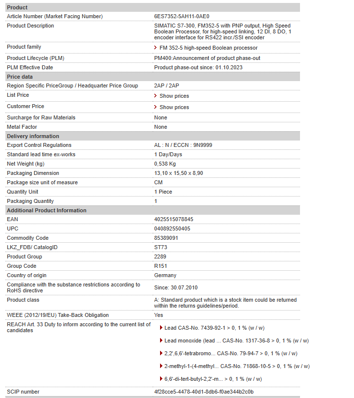| SIMATIC S7-300, FM352-5 with PNP output, High Speed Boolean Processor, for high-speed linking, 12 DI, 8 DO, 1 encoder interface for RS422 incr./SSI encoder |