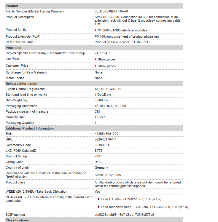 SIMATIC S7-300, Connection IM 365 for connection of an extension rack without C bus, 2 modules+ connecting cable 1 m