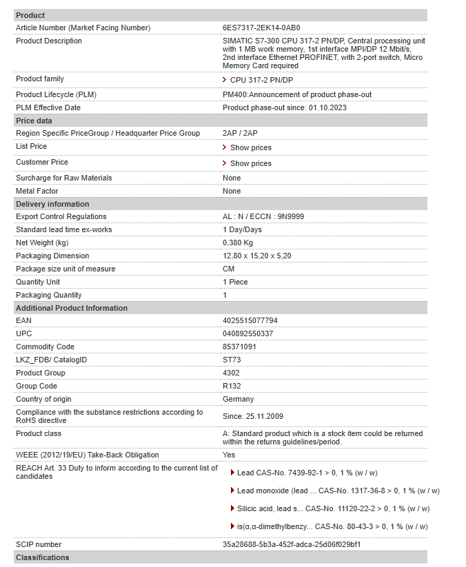 SIMATIC S7-300 CPU 317-2 PN/DP, Central processing unit with 1 MB work memory, 1st interface MPI/DP 12 Mbit/s, 2nd interface Ethernet PROFINET, with 2-port switch, Micro Memory Card required