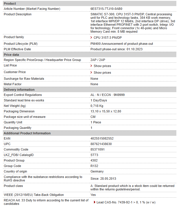 SIMATIC S7-300, CPU 315T-3 PN/DP, Central processing unit for PLC and technology tasks, 384 KB work memory, 1st interface MPI/DP 12 Mbit/s, 2nd interface DP (drive), 3rd interface Ethernet PROFINET with 2-port switch, Integr. I/O for technology, Front connector (1x 40-pole) and Micro Memory Card min. 8 MB required