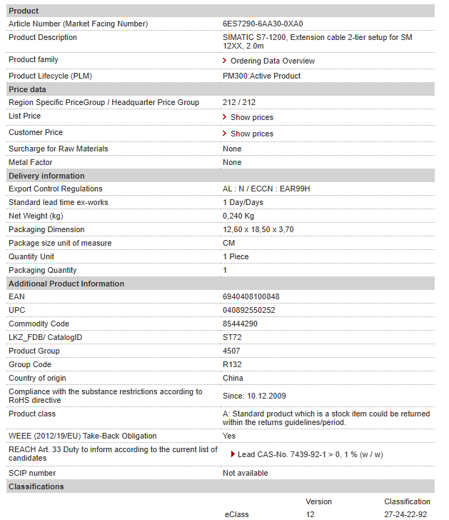 SIMATIC S7-1200, Extension cable 2-tier setup for SM 12XX, 2.0m