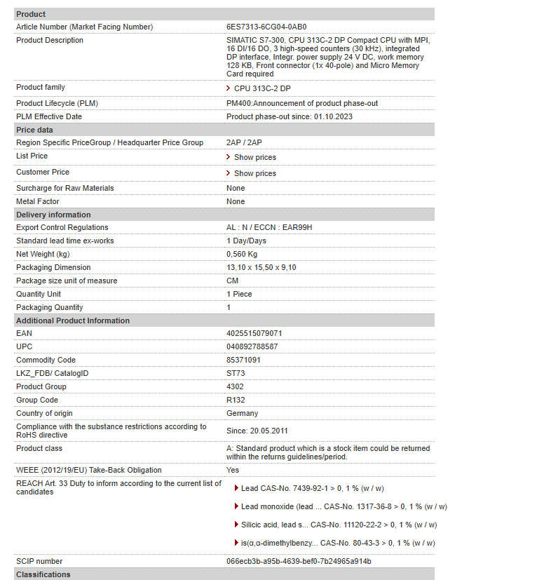 | SIMATIC S7-300, CPU 313C-2 DP Compact CPU with MPI, 16 DI/16 DO, 3 high-speed counters (30 kHz), integrated DP interface, Integr. power supply 24 V DC, work memory 128 KB, Front connector (1x 40-pole) and Micro Memory Card required |