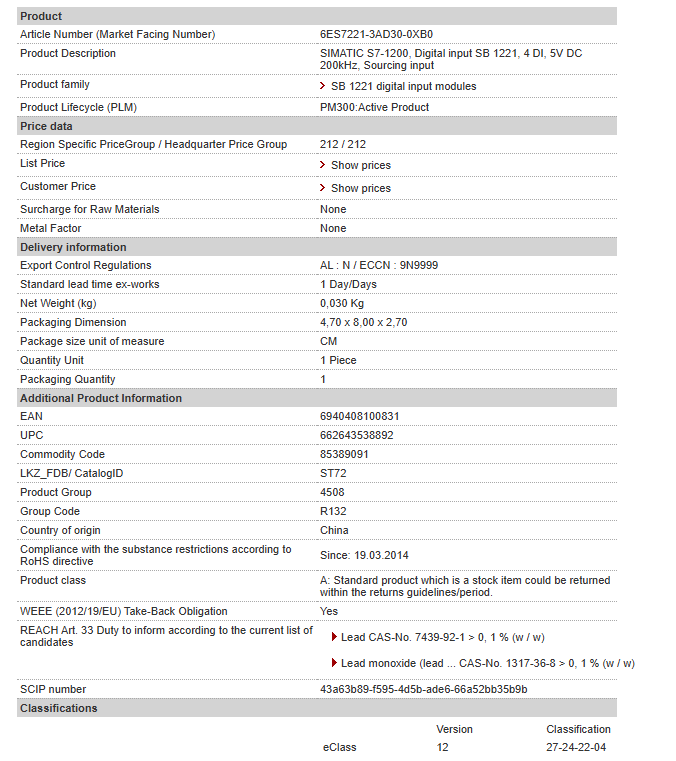SIMATIC S7-1200, Digital input SB 1221, 4 DI, 5V DC 200kHz, Sourcing input