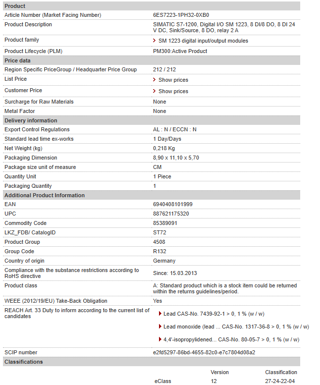 SIMATIC S7-1200, Digital I/O SM 1223, 8 DI/8 DO, 8 DI 24 V DC, Sink/Source, 8 DO, relay 2 A