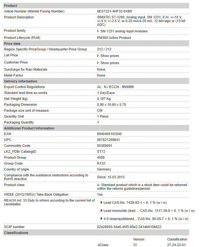 SIMATIC S7-1200, Analog input, SM 1231, 8 AI, +/-10 V, +/-5 V, +/-2.5 V, or 0-20 mA/4-20 mA, 12 bit+sign or (13 bit ADC)